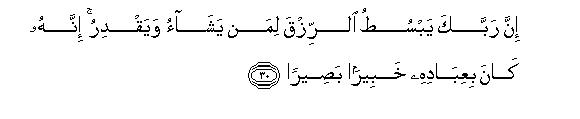 [29-30] 6. Do not tie your hand to your neck nor stretch without any restraint lest you should become blameworthy and left destitute.29 Your Lord provides plentifully to whom He wills and withholds His provisions from anyone He pleases, for He is fully aware of the condition of His servants and observes them closely.30