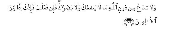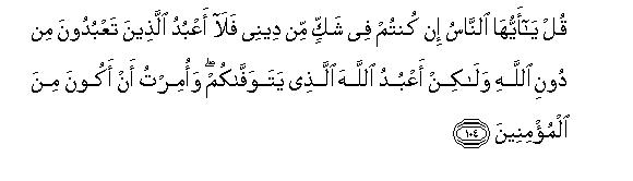 [104-107] O Prophet say,106 O mankind! if you are still in doubt concerning my Faith, know that I do not worship those whom you worship beside Allah, but I worship that Allah alone, Who has the power to cause your death.107 I have been commanded that I should be of the believers. I have also been bidden: Dedicate yourself sincerely, and exclusively and steadfastly to this Faith108 and be not at all of those who associate other gods with Allah.109 And do not invoke beside Allah any being that can neither do you good nor harm: for if you will do so, you shall be one of the workers of iniquity. If Allah afflicts you with a calamity, there is none to remove it but He Himself. Likewise if He wills to bestow a favor on you, there is none to withhold His bounty. He bestows His bounty on anyone of His servants He wills. And He is Forgiving and Merciful."