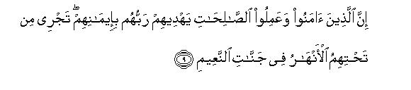 [9-10] And it is also a fact that, because of their faith, Allah will guide aright those who believe (sincerely in the Truths that have been presented in this Book) and do righteous deeds; and canals will be flowing underneath there in the Gardens of bliss.13 Therein their prayers will be. "Glory to Thee, O Lord," and their greeting, "Peace be to you," and the burden of their hymn will be, "Praise is for Allah alone, the Lord of the universe."14