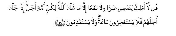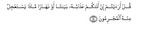 [48-52] They ask "When will this threat come to pass ? Tell us if what you say be true. " Say "I have no power to bring benefits or to avert evils from myself: everything depends upon Allah's will.57 Every ummat has its appointed term: when that term expires it is neither delayed nor advanced for them by a single hour."58 Ask them "Have you ever considered this? (What can you do to avert it,) if His scourge comes upon you suddenly by night or by day ? Why is it that the criminals are seeking to hasten it?" What! will you believe in it, when it actually overtakes you?-Do you want to escape from it now, when you yourselves were demanding it? Then it will be said to the transgressors, "Now taste the everlasting torment; what other recompense than this do you expect to get for what you have been earning?"