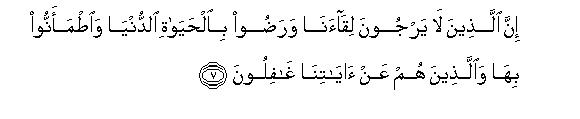 [7-8] The fact is that the ultimate abode of those, who expect not to meet Us and are well pleased and satisfied with this worldly life and pay no heed to Our Signs, shall be Hell in consequence of the evils they earned (because of this erroneous creed and wrong conduct.)12