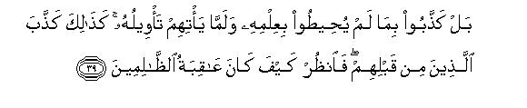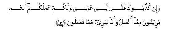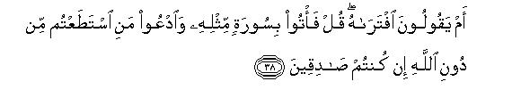 [38-41] Do they say that the Prophet has composed it himself? Tell them,. "If what you say be true, then produce one surah like this and you may call to your assistance anyone you can other than Allah."46 The fact is that they have denied (on mere conjecture) what was not within the reach of their knowledge nor had they, as yet, tasted its consequences.47 Likewise, the people who went before them declared as false the Revelations, but behold, what was the end of those unjust people! Some of these people will believe in it and others will not, and your Lord knows these mischief-makers48 very well indeed. If these people declare that you are an impostor say to them "I am responsible for my deeds and you are for yours: you are not accountable for what I do, and I am not for what you do.”49