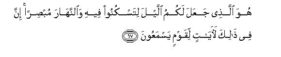 The Qur'an has inculcated this method at many places and has over and again presented many a phenomenon as a proof of the Reality, and taught the people how to arrive at the right conclusion so as to perceive the Reality. Accordingly, in verse 67, the Sign of the night and the day has been presented for the deep consideration of the people. The change of day and night is a wonderful Sign and clearly points to the Universal Designer and the All-Powerful Ruler; for it takes place by the turning of the earth on its axis and in relation to the sun with mathematical precision. This change is due to the great wisdom of the Designer and has a great purpose behind it because of its innumerable benefits for all that exists on the earth. This points out also to the Providence of the Creator for it demonstrates conclusively that He has made perfect arrangements for the existence of His creation. Moreover, this also shows that the Universal Designer is One and also that He is not playful but Wise and purposeful. This change points also towards the great Reality that He, being the Benefactor and Lord, is worthy of worship and none else. This is because every other being is provided with its requirements by this change of day and night and none provides others; therefore none of them can be the Lord and the Master. In the light of these Signs, how can, any other religion, based on mere surmise and guess-work, be considered to be true when it is compared with the Revealed Religion which is based on such clear Signs as these?
