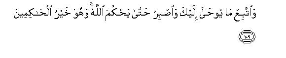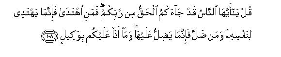 [108-109] O Muhammad, tell them, "O mankind! the Truth has come to you from your Lord. Now, whosoever follows the Right way, he does so for his own good, and whosoever goes astray, he does so to bring about his own ruin; and I am not a keeper over you. " And, O Prophet, go on following the Guidance that has been revealed to you; persevere steadfastly till Allah passes His judgment, for He is the best of judges.