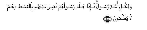 [47] There is a Messenger for every ummat.55 then, when its Messenger comes a just judgment is passed on its people and they are not wronged in the least.56