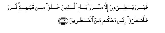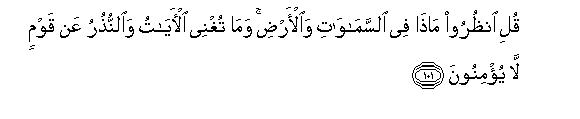[101-103] Say to them, "Make a keen observation of all that is in the heavens and the earth." And (the fact is that) the Signs and warnings are of no avail to those who would not believe.105 Now what do they wait for but the evil days that befell the peoples before them? Say to them, "Well, wait and see, I, too, wait with you." Then, (when such a time comes), We deliver Our Messengers and those who believed in them-This is Our Way: We have laid it on Ourselves to deliver the believers.