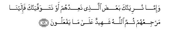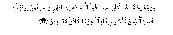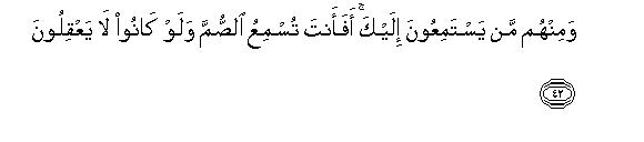 [42-46] There are many among them who hear what you say: but will you make the deaf listen to you even though they be incapable of understanding it?50 Then there are many others among them who see you: but will you show the way to the blind, even though they be bereft of sight?51 The fact is that Allah does not in any way wrong the people but they wrong themselves.52 (Today these people are intoxicated with the life of this world but) on the Day when Allah will muster them they will feel as if they had stayed (in this world) for only an hour53 or so in order to have acquaintance with one another. (At that time they will realize that) they who disbelieved in their meeting with Allah were losers54 indeed and were not rightly guided. Maybe, We let you witness some of the dire consequences with which We threaten them or raise you to Ourselves before this. Anyway they shall have to return to Us and Allah is a witness to what they are doing.