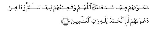 14These facts about the life in Paradise have been stated in order to make conspicuous the high thinking and the noble qualities of the Believers. When they enter Paradise after coming out successful in this worldly test they will manifest the same high qualities of character that they had in this world. Instead of making urgent and immediate demands for beautiful articles of luxury, musical instruments, wine and women, they will sing hymns of praise to their Lord. This also belies that picture of the lift in Paradise that some crooked people have formed of it. The fact is that the noble personalities which the Believers build in this world and the high ways of thinking and the excellent moral characters they form in this world and the great and rigid training they give to their feelings, emotions and desires, will become all the more prominent in the pure surroundings and environments of Paradise. That is why they will love it most to sing hymns of praise to Allah and glorify His name just as they did in this world. Besides this, their greatest wish and desire in Paradise will be peace for one another, as it was in their collective life in this world.