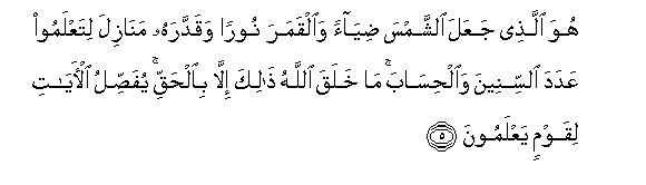 [5-6] It is He Who gave the sun his brightness and the moon her light, and ordained her phases precisely so that you may calculate years and dates from this. Allah has not created all this (for mere fun) but for a serious end. He makes His Signs manifest for those people who possess knowledge. In the alternation of the night and day and in all that Allah has created in the heavens and the earth, surely there are Signs for those who intend avoiding (deviation from the Truth)11