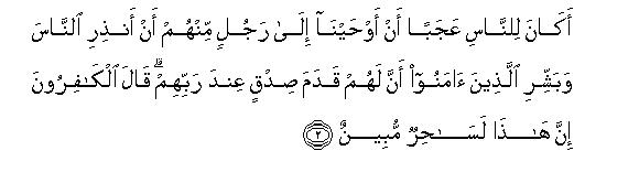 [2] "Did it seem strange to the people that We should have inspired a man from among themselves to warn the (neglectful) people, and to give the Believers the good news that they will have real honor and success with their Lord?2 (Is this the thing that) led the unbelievers to say, "This man is a manifest enchanter?"3