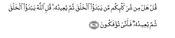 [34] Ask them "Is there any of the partners you have set up with Allah who originates creation and then brings it back again?41 Say: "It is Allah Who originates creation and brings it back again. How then are you being perverted to the wrong ways of shirk?"42