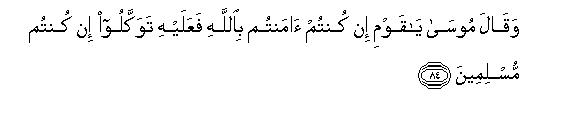 [84-86] Moses said to his people, "O my people, if you sincerely believe in Allah, put your trust in Him, if you are Muslims. "81 They answered,82 "We have put our trust in Allah: `Our Lord, do not make us a cause of trial83 for the unjust people, and deliver us by Thy mercy from the unbelievers'."