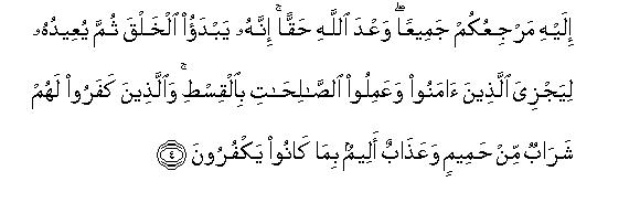 [4] To Him you shall all return:8 this is the true and sure promise of Allah. Indeed He originates creation and He will bring it back to life9 so that He may recompense with perfect justice those who believed and did righteous deeds. As for those who disbelieved, they shall drink boiling water and undergo a painful chastisement for their rejection of the Truth.10