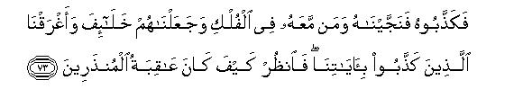 [71-74] Recite69 to them Noah's story, when he said to his people; "O my brethren, if it has become intolerable for you that I should dwell in your midst and preach to you the Revelations of Allah, then (note it well that) I have put my trust in Allah. You may muster all the partners you have set up and come to a united decision about me and consider your scheme well so that no aspect of the matter should remain hidden from you. Then bring that into action against me without giving me any respite.70 If you have turned away from my Message, (I have lost nothing) for I did not demand any reward from you: my reward is with Allah, and I have been commanded to behave like a Muslim, (whether any other does so or not.)" But they disbelieved in him and the result was that We rescued those of them, who were with him in the Ark and made them successors on the earth and drowned those who rejected Our Revelations. So consider the end of those who were warned (but did not believe). After Noah We sent different Messengers to their peoples and they came to them with manifest Signs, but they would not believe in what they had disbelieved before. This is how We set a seal on the hearts of the transgressors.71