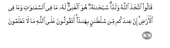 68Three things have been put forward to refute their blasphemy: (1) Allah is pure and without any defect, (2) Allah is Self-sufficient in every way, and (3) Allah is the Owner of everything in the heavens and the earth. Let us now briefly explain how these three things refute that blasphemy.