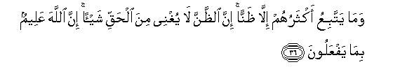 [36] The fact is that most of them are following mere conjecture,44 as whereas conjecture cannot in any way fulfill the requirements of the true knowledge. Allah has full knowledge of what they are doing.