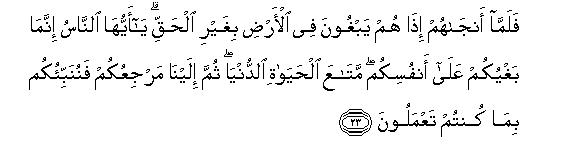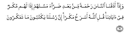[21-28] This is how people behave: No sooner do We show mercy to them after some calamity had afflicted them than they begin to practice deceptions29 concerning Our Signs. Say to them, "Allah is more swift in His plans than you: indeed His angels are keeping a full record of your acts of deception.30 It is Allah Who enables you to travel over land and by sea. So you set sails in ships, rejoicing over a fair breeze. Then all of a sudden a strong wind begins to rage against the passengers and billows begin to surge upon them from every side and they realize that they have been encircled by the tempest. At that time they pray to Allah with sincere faith, saying, "If You deliver us from this peril, we will become Your grateful servants."31 But when He delivers them, the same people begin to rebel in the land against the Truth. O people, this rebellion of yours is harmful only to yourselves. (You may enjoy) the transitory pleasures of this world, then you have to return to Us: then We will let you know what you have been doing. This worldly life (which has so enamored you that you have become neglectful of Our Signs) may be likened to the produce of the earth: We sent rain-water from the sky, and the crops of which man and animals eat, grew up luxuriantly. Then at that very time, when the land was at its best, and the crops had ripened and decked out and the owners were presuming that they would be able to benefit from them, Our Command came all of a sudden by night or by day, and We destroyed it so thoroughly as though nothing had existed there the previous day.31a Thus We expound Our Signs in detail for the consideration of those people who are thoughtful. (You are being deluded by this transitory life,) and Allah invites you to the Abode of Peace.32 (Guidance is in His power,) and He guides to the Right Way whomsoever He pleases. Those who have done excellent works will get excellent rewards, and even more than their merits:33 neither gloom nor disgrace shall cover their faces. They deserve the Garden, where they will abide for ever. And those who have earned evil deeds shall have their recompense according to the evil they earned:34 disgrace shall set over them: there shall be none to protect them from Allah: their faces shall be covered with such gloom35 as if the black veils of the night had fallen over them: they deserve Hell, wherein they shall abide for ever. On the Day We will muster them together (in Our Court,) We will say to those who committed shirk, "Stay where you are, you and those whom you set as partners with Us." Then We will remove the state of strangeness from among them,36 and the partners they had set up will say, "You did not worship us."