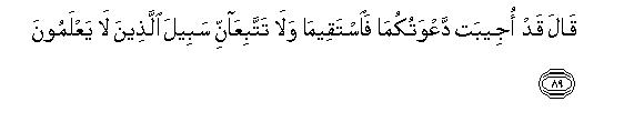 [88-89] Moses prayed86 and said, "Our Lord, Thou hast bestowed on Pharaoh and his chiefs splendor87 and possessions88 in the worldly life; our Lord, hast Thou done this that they may lead astray the people from Thy Way ? Lord, destroy their wealth and harden their hearts in a manner so that they may not believe till they see the painful torment."89 Allah replied, "The prayer of you both has been granted; so be steadfast and follow not the way of those who have no knowledge.90