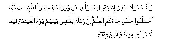 [93] We gave an excellent abode94 to the children of Israel and provided them with the best things of life. Then they caused not dissensions among themselves until the knowledge had come to them.95 Surely your Lord will decide between them on the Day of Resurrection concerning that in which they had been differing.
