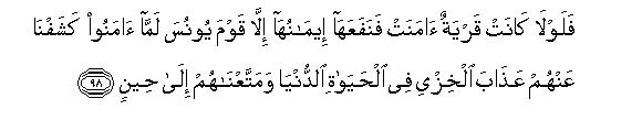[96-98] The fact is that whatsoever Signs are shown to those who have fallen under Allah's decree,97 they will not believe till they see the painful torment. Then, is there any instance of a habitation that, seeing the torment, accepted the faith and that faith profited it? (There is no instance of this) except that of Jonah's people.98 When they believed, We warded off the torment of ignominy from them in this worldly life99 and allowed them to make use of the things of life for a while.100