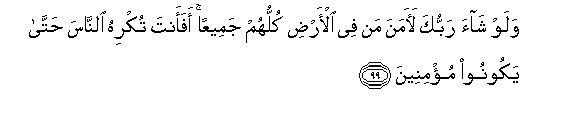 [99-100] Had your Lord willed (that all the people of the world should be believers), all the dwellers of the earth would have believed in Him101 Will you, then, force the people to become believers?102 No one can believe without Allah's permission,103 and it is the way of Allah that He throws filth on those who do not use their commonsense.104