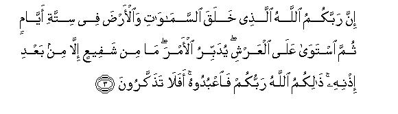 [3] The fact is that your Lord is the same Allah Who created the heavens and the earth in six days, then sat Himself upon the Throne of His Kingdom, and is directing the affairs of the universe.4 None can intercede with Him except after His permissions5 That is Allah, your Lord: so worship Him.6 Will you not then understand?7