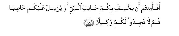 82This passage (vv. 66-72) is closely connected with the previous one. It tells man that if he wants to protect himself from the allurements, temptations and false promises of Satan who has been his avowed enemy from the day of his creation, he should recognize his real Lord and be steadfast in His obedience. Satan intends to prove that man is not worthy of the honor with which Allah has blessed him. Therefore if he follows any other way he cannot escape the snares of Satan.