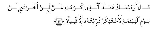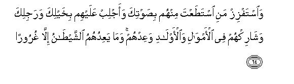 [61-65] And remember: when We commanded the angels, "Bow yourselves before Adam," all bowed down except Iblis.74 He replied, "Should I bow before the one whom you have created of clay?" Then he added, "Just consider this: Was he worthy of this that you have exalted him over me ? If you give me respite up to the Day of Resurrection, I will uproot the whole of his progeny;75 there shall be only a few of them who will be able to save themselves from me." Allah replied, "Well, get away. Hell is your ample reward and the reward of those who follow you. You may try to allure with your invitation whomsoever you can.76 Rally against them your horsemen and your footmen:77 set a partner with them in their wealth and children78 and entice them with your false promises And Star's promises are nothing but deception.79 Indeed you will have no power over my servants."80 And your Lord suffices for you as a guardian.81