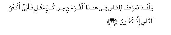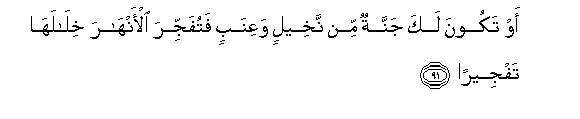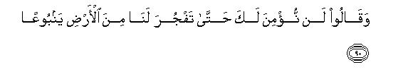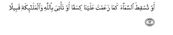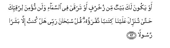 [89-93] In this Qur'an, We employed different ways to make the people understand the Message, but the majority of them persisted in unbelief, and they said, "We will not believe in what you say until you cause a spring to gush forth from the earth for us, or a garden of date-palms and vines be created for you, and you cause canals to flow in it; or until you cause the sky to fall on us in fragments, as you threaten us; or you bring Allah and the angels face to face before us or a house of gold comes into being for you or you ascend the sky, and we are not going to believe in your ascension until you bring down to us a writing that we may read"O Muhammad, Say to them, "My Lord be glorified! have I ever claimed to be anything more than a human Messenger?"106