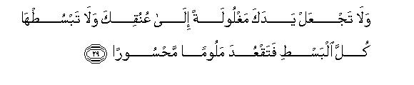 [29-30] 6. Do not tie your hand to your neck nor stretch without any restraint lest you should become blameworthy and left destitute.29 Your Lord provides plentifully to whom He wills and withholds His provisions from anyone He pleases, for He is fully aware of the condition of His servants and observes them closely.30