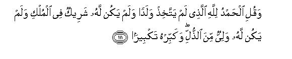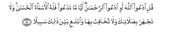 [110-111] O Prophet, say to them, “You may call Him by any name, Allah or Rahman, for it is all the same by whichever name you call Him because all His names are most excellent.123 And do not raise your voice high in your Prayer nor make it very low but adopt the middle way124 between these two and say, “Praise is for that Allah who has begotten no son nor has any partner in His Kingdom nor is helpless to need any supporter,”125 And glorify Him in the most glorious way.”