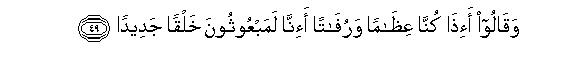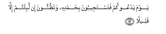 [49-52] They say, "What! shall we really be raised up again into a new creation, when we are reduced to bones and dust?" Say to them, ("yes, most certainly you shall be brought back to life,) even if you be stone or iron or even something harder than this which you consider in your minds impossible to be brought to life." At this they will ask, "Who is he who will bring us back to life?" Say to them, "The same Being Who brought you to life in the first instance." Then they will shake their heads at you and ask.55 "Well, when will this happen?" Say, "That time may be near at hand. On the Day when He will call you, you will rise up in response to it, praising Him, and you will think, "We have remained in this state only for a little while."56