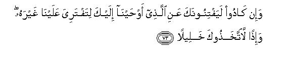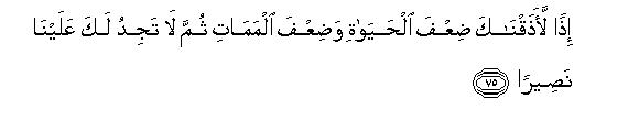 [73-75] O Muhammad these people have left no stone unturned to tempt you away from that which We have revealed to you so that you might fabricate something in Our name.87 Had you done that, they would have made you their friend. It was just possible that you might have inclined a little towards them, if We had not given you strength. But if you had done so, We would have made you taste double chastisement in this world as well as in the Hereafter: then you would have found no helper against Us.88
