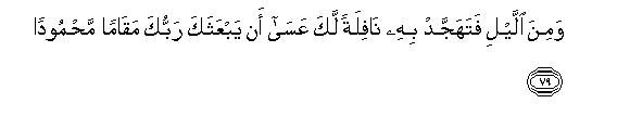 [78-79] Establish Salat91 from the declining of the sun92 to the darkness of the night,93 and be particular about the recital of the Qur'an94 at the dawn of the morning, for the recital of the Qur'an at the dawn is witnessed.95 Besides this, offer Tahajjud Prayer96 at night: this is an additional prayer for you.97 That time is not far when your Lord may exalt you to a laudable position.98