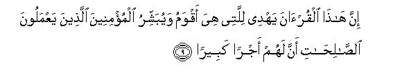 [9-10] Indeed the Qur'an shows that way which is perfectly straight: To those who believe in it and do good deeds, it gives the good news that there is a great reward for them and to those who do not believe in the Hereafter, it gives the warning that a painful torment has been made ready for them.11