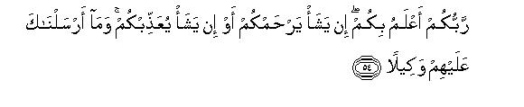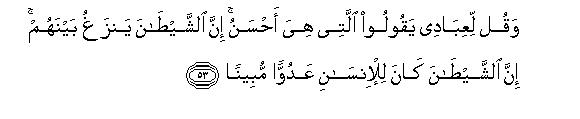 [53-54] And O Muhammad!, say to My servants,57 "They should utter only that which is the best of all.58 In reality, it is Satan who tries to sow discord between human beings. The fact is that Satan is the avowed enemy of man.59 Your Lord is fully aware of everything concerning you. If He will, He may show mercy to you, and if He will, He may give you severe chastisement."60 And, O Prophet, We have not sent you to be the guardian over people.61
