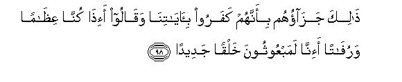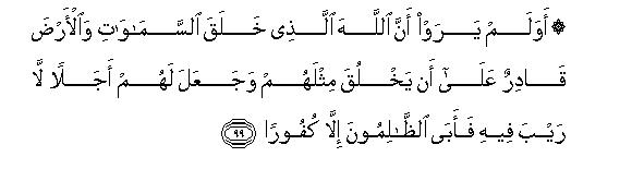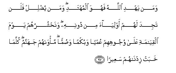 [97-99] Whomsoever Allah guides, he alone is rightly guided and whomsoever He lets go astray, you will find for such people no other protector and helper besides Him.110 On the Day of Resurrection, We will muster them prostrate upon their faces, blind, dumb and deaf.111 Their abode will be Hell: whenever its fire abates, We will rekindle it for them. This is their recompense, for they rejected Our Signs and said, "What! shall we really be raised up anew, when we have been reduced to bones and dust?" Could they not perceive that the same Allah, Who created the Earth and the Heavens, has the power to create the like of them? He has ordained a time for resurrecting them which shall inevitably come, but these workers of iniquity persist in their disbelief.