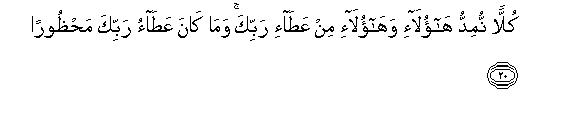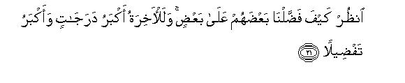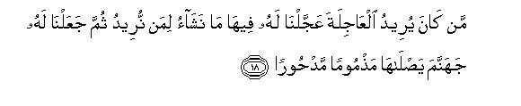 [18-21] If a person hankers after the immediate good things of this worldly life,19 We give him whatever We will; then We condemn such a one to Hell, wherein he will burn, accursed and deprived of mercy.20 On the other hand, whoso desires the life of the Hereafter and strives for it as best as one should strive, and is a believer, the endeavor of every such person will be appreciated.21 As regards the provisions of this worldly life, We bestow them on these and on those; this is a gift of your Lord and there is none to withhold the gift of your Lord.22 But in spite of this you can see that We have exalted one people above the others and in the Hereafter these grades will be far greater, and their superiority will be far higher.23