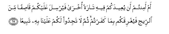 [69-72] Or, are you not afraid that God may again send you to the sea and smite you with a violent tempest and drown you for your ingratitude, and you may not find any one to question Us in regard to this end of yours? It is a favor that We have honored the sons of Adam and blessed them with conveyances on land and sea and provided them with good and pure things and exalted them above many of Our other creatures.85 Just imagine the scene on the Day, when We will summon every community with its leader: then those, who will be given their records in their right hands, will read their records86 and will not be wronged in the least; on the other hand, the one, who leads his life in this world as if he were blind shall be blind in the Hereafter. nay, he shall fare even worse than a blind person in finding the way.