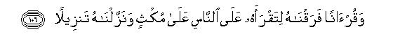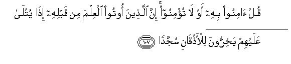 [105-109] We have sent down the Qur'an with the truth and with the truth it has come down; and O Muhammad, We have sent you only to give good news (to the Believers) and warning (to the disbelievers).118 And we have sent down this Qur'an piecemeal so that you may recite it to the people gradually piece by piece, and We have sent it down by gradual Revelations119 (to suit particular occasions).O Muhammad, say to these people, “Whether you believe in it or not, those who were given the knowledge before this,120 fall prostrate on their faces when it is recited to them and cry out, “Our lord is glorious and His promise was surely to be fulfilled.” And they fall down on their faces, weeping when they listen to it, and this increases their Humility121 all the more.122