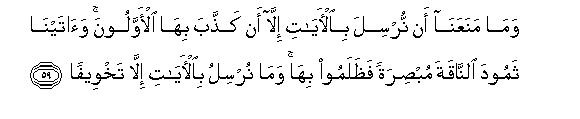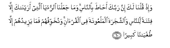 [59-60] And nothing has hindered Us from sending Signs67 except that the former people refused to acknowledge them as such. (For example,) We sent the She-camel as an open Sign to Thamud but they treated her with cruelty;68 whereas We send Signs only by way of warning.69 Call to mind, O Muhammad! We told you at the very beginning that your Lord is encircling these people.70 And We made what We have shown you now71 and also the Tree which has been cursed in the Qur'an72 as a trial for these people." We are giving them warning after warning but each warning helps only to increase their insurrection.73