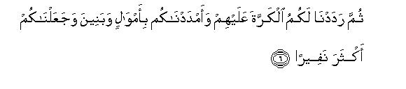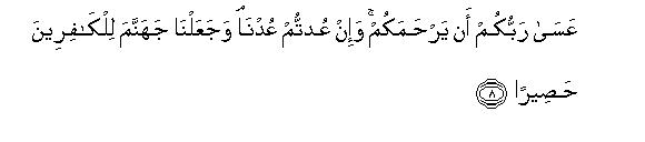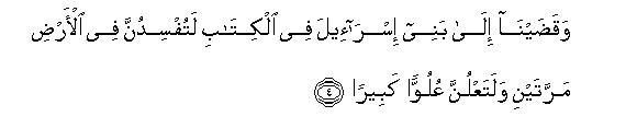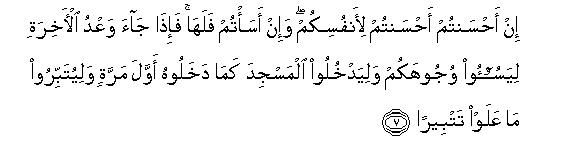 [2-8] Before this We had given the Book to Moses and made it a means of guidance for the Israelites2 with this Command: "Do not make .any other guardian than Myself.3 You are the descendants of those whom We bore in the Ark with Noah,4 and he was truly a grateful servant". Besides this, We forewarned the Israelites in the Scriptures:5 You will work great mischief twice in the land and will become overbearingly arrogant.6 When the occasion of the first of the two mischiefs came, O Israelites, We raised against you such of Our servants who were very mighty and formidable; so they penetrated through all parts of your country. This was a warning that was bound to be fulfilled.7 Then after this We afforded you an opportunity to over-power them and helped you with abundance of riches and children and increased you far more in numbers than before.8 Behold! If you did good it proved to be good for yourselves and if you committed evil it proved to be bad for your own selves. Then, when the time came for the fulfillment of the second warning, We set other enemies on you so that they might disfigure your faces and enter into the Temple just as the former enemies had entered and destroyed whatever they could lay their hands on.9 Now again your Lord may show compassion on you; but if you again repeat your former behavior; We will again visit you with. Our punishment, for We have prepared Hell to serve as a prison-house for the ungrateful people.10