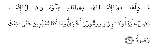 [15] Whosoever adopts the righteous way, his righteous conduct will be for his own good, and whosoever goes astray, his deviation shall bring its consequences on him.15 No bearer will bear the burden of another.16 And We do not inflict punishment until We have sent a Messenger17 (to make Truth distinct from falsehood.)