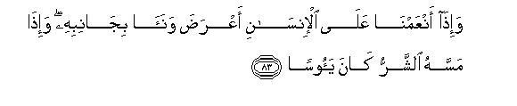[82-84] We are sending down to you through the revelation of the Qur'an what is a healing and mercy to the Believers, though it adds nothing but loss to the workers of iniquity.102 Man is a (strange) creature: when We bestow favor on him, he behaves arrogantly and turns his back, but when misfortune befalls him, he begins to despair. O Prophet, say to them, "Everyone is following his own way but your Lord alone knows best who is on the right way."