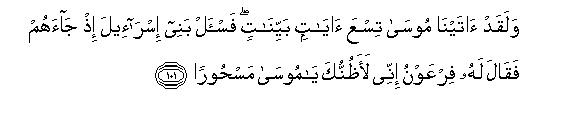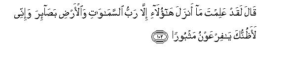 113It should be noted that this is the third answer to the demand of the disbelievers of Makkah for Signs. They said, "We will not believe in you until you do this and do that before our eyes." In answer to this demand, they are being warned: "Nine clear Signs, like the ones you are demanding, were shown one after the other to Pharaoh before you and you also know full well what he said, simply because he did not want to believe in Moses; you also know that when he rejected the Prophet, even after seeing the Signs, We drowned him."