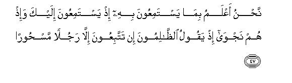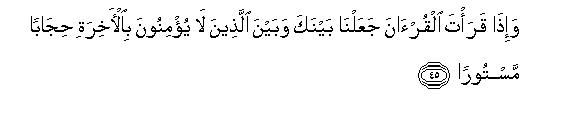 [45-48] When you recite the Qur'an, we place an invisible curtain between you and those who do not believe in the Hereafter and we cover their hearts with a covering so that they understand nothing and we make their ears hard of hearing.51 And when in the Qur'an you mention your one Lord only, they turn their faces away in aversion.52 We know best what they really wish to hear, when they listen to you, and also what they say, when they sit together in secret conversation. These wrongdoers say to one another, "The man you are following is really bewitched"53 Behold! what epithets they apply to you! They have gone astray, so they cannot find the Right Way.54