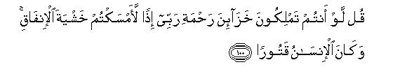 [100] O Muhammad, say to them, "Had the treasures of your Lord's blessings been in your possession, you would have held them back lest they should be spent up. Indeed man is very narrow minded."112