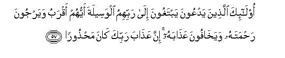 [56-57] Say to them, "You may invoke for help those deities whom you consider to be (your helpers) beside Allah: They will not be able to relieve you of any trouble nor change it."64 In fact those whom these people invoke for help themselves seek means of approach to their Lord and vie with one another to be nearer to Him and hope for His mercy and fear His chastisement.65 The fact is that the chastisement of your Lord is a thing to be dreaded.