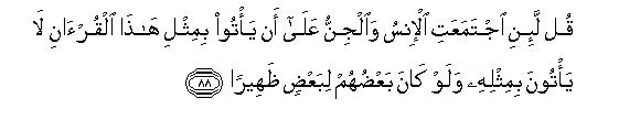 (1) The Qur'an is such a miracle in regard to its language, style, arguments, themes, topics, teachings and prophecies that it is beyond any human power to produce the like of it, as if to say, "You say that a man has invented this but We challenge that even the whole of mankind combined cannot produce a Book like this: nay, even if the jinns, whom the mushriks worship as deities and whom this Book openly attacks, should come to the help of the disbelievers, they cannot produce a Book like this to refute this challenge."