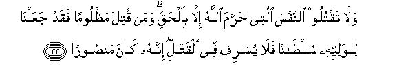 [33] 9. Do not kill any soul whose killing has been forbidden by Allah33 except by right:34 and if one is killed unjustly We have granted the right of retribution to his guardian.35 So he should not transgress the limits in retaliation,36 for he shall be helped.37